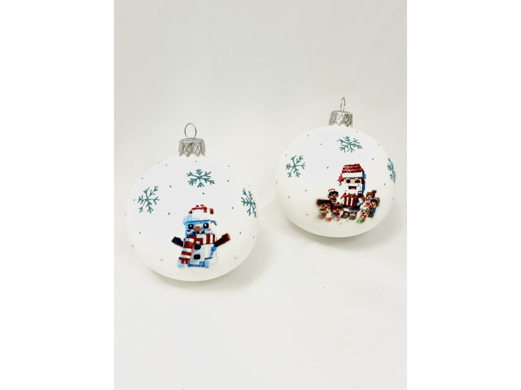 Tato originální dvoudílná sada přináší na vánoční stromeček radost v pixelovém stylu. Obě ozdoby jsou ručně foukané a malované českými sklářskými mistry, kteří spojují tradiční výrobu s moderním hravým motivem. První koule zobrazuje veselého pixelového sněhuláka v červené čepici a pruhované šále, doplněného třpytivými modrými vločkami. Druhá koule zachycuje Santovu radostnou chvíli mezi dětmi s dárky, rovněž obklopenou jemnými vločkami. Matný bílý podklad evokuje zimní atmosféru, zatímco glitrové detaily dodávají ozdobám kouzelný lesk. Sada je uložena v pevné krabičce a připravena potěšit jako originální vánoční dárek.Doplňkové parametry