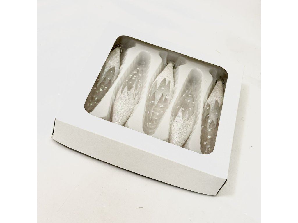 Tato sada pěti ručně vyráběných skleněných rampouchů o délce 14 cm z dílny Irisa Vsetín představuje dokonalé spojení elegance a přírodního kouzla zimy. Každý rampouch je ozdoben třpytivým ledovým povrchem s jemným přechodem do průhledného skla, které působí, jako by bylo polité čerstvým sněhem. Lesklé glitrové detaily zachycují světlo a vytvářejí dojem, že rampouchy skutečně září mrazivým chladem. Tyto tradiční české vánoční ozdoby se skvěle kombinují s bílými či stříbrnými koulemi a doplňují kolekci Zimní elegance. Dodávají stromku lehkost, třpyt a příjemný pocit klidu, který k Vánocům neodmyslitelně patří.Doplňkové parametry