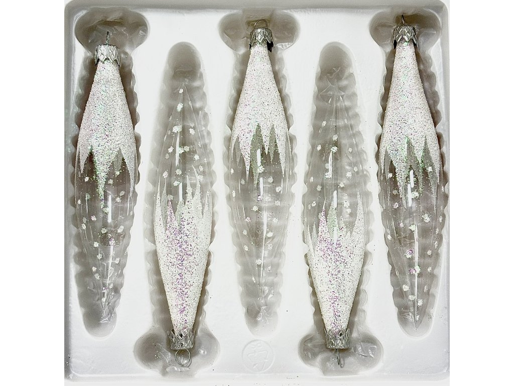 Sada skleněných rampouchů s ledovým efektem – Třpyt zimní noci (sada 5 ks, 14 x 3 cm)