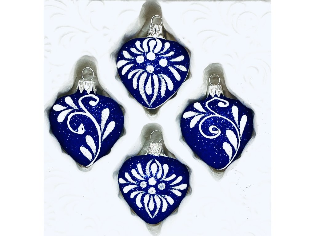 Sada skleněných srdcí - 4 ks (5 cm) - modré s lidovým motivem