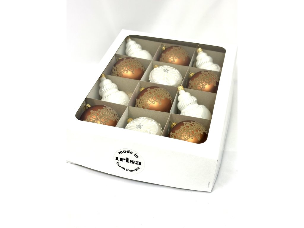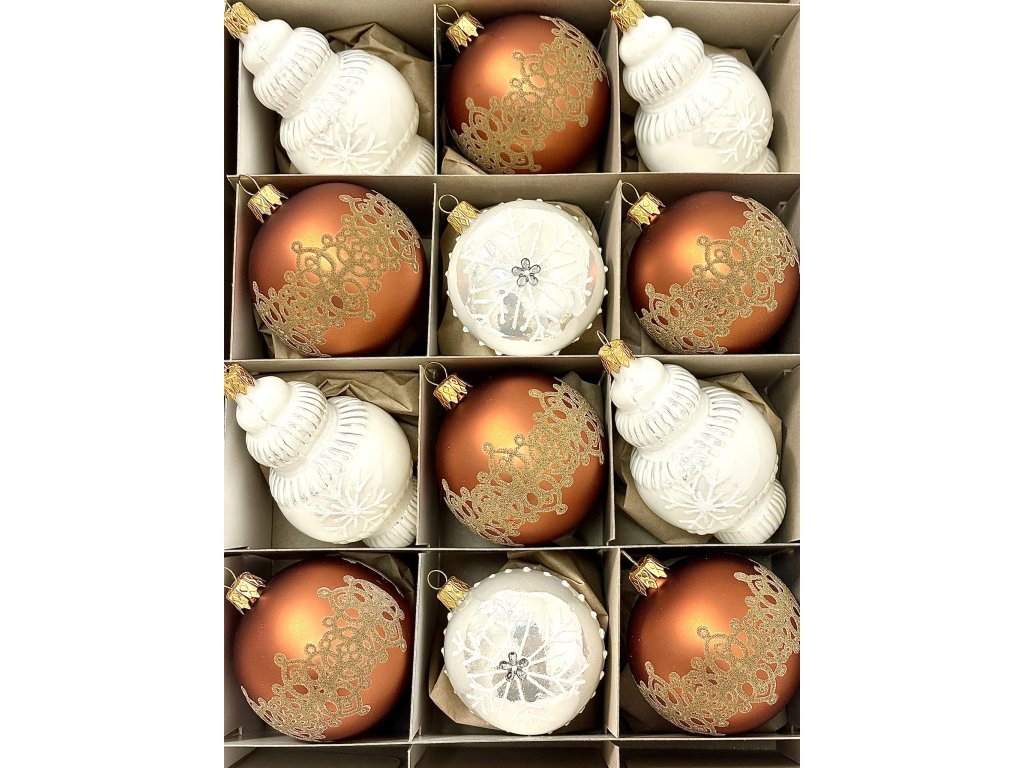 Sada skleněných vánočních ozdob – Měděná elegance a bílá něha (12 ks , 8 cm )