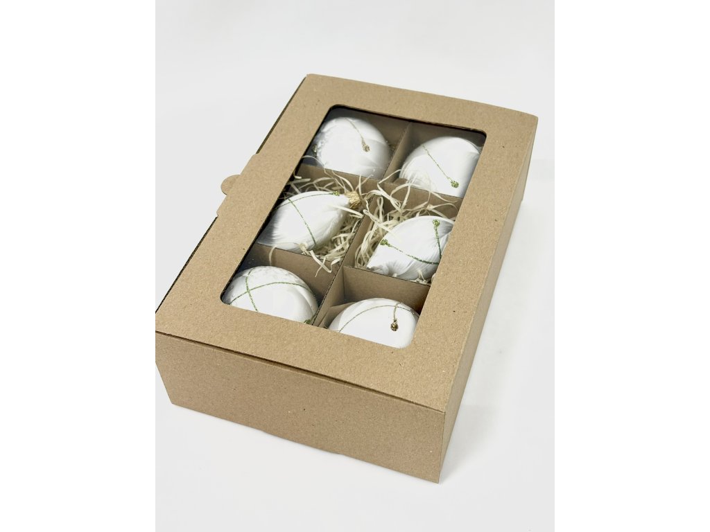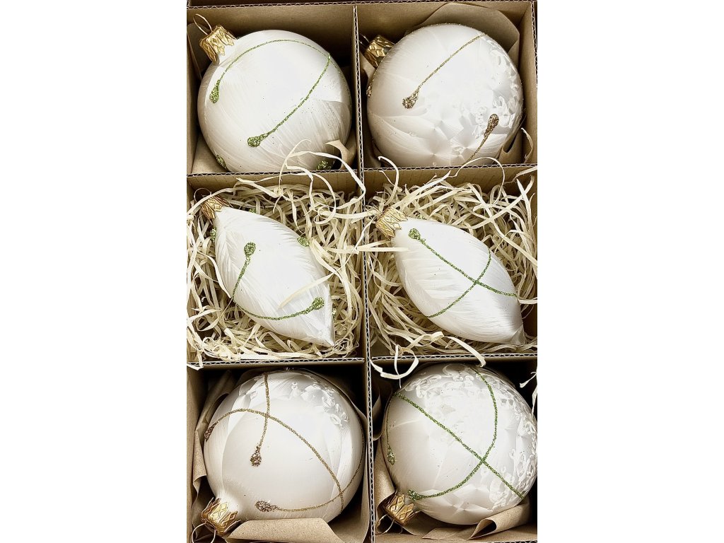 Nechte svůj vánoční stromeček zazářit v jemné bílé eleganci. Tato sada šesti ručně foukaných ozdob kombinuje klasické kulaté koule a protáhlé olivy, zdobené zelenými a zlatými glitrovými linkami, které vytvářejí dojem jemného pohybu a lehkosti. Bílý perleťový základ se třpytí jako čerstvý sníh, zatímco decentní zlaté detaily dodávají celé kolekci nádech luxusu. Každý kus je originál, ručně vyráběný a zdobený českými malířkami v tradiční sklárně Irisa Vsetín. Tato sada je ideální volbou pro ty, kdo milují harmonii, čistotu a tradiční řemeslnou krásu, která dokáže proměnit každý vánoční stromek v elegantní ozdobu domova.