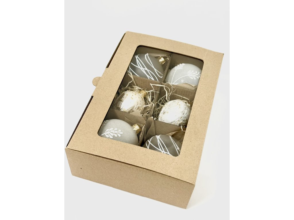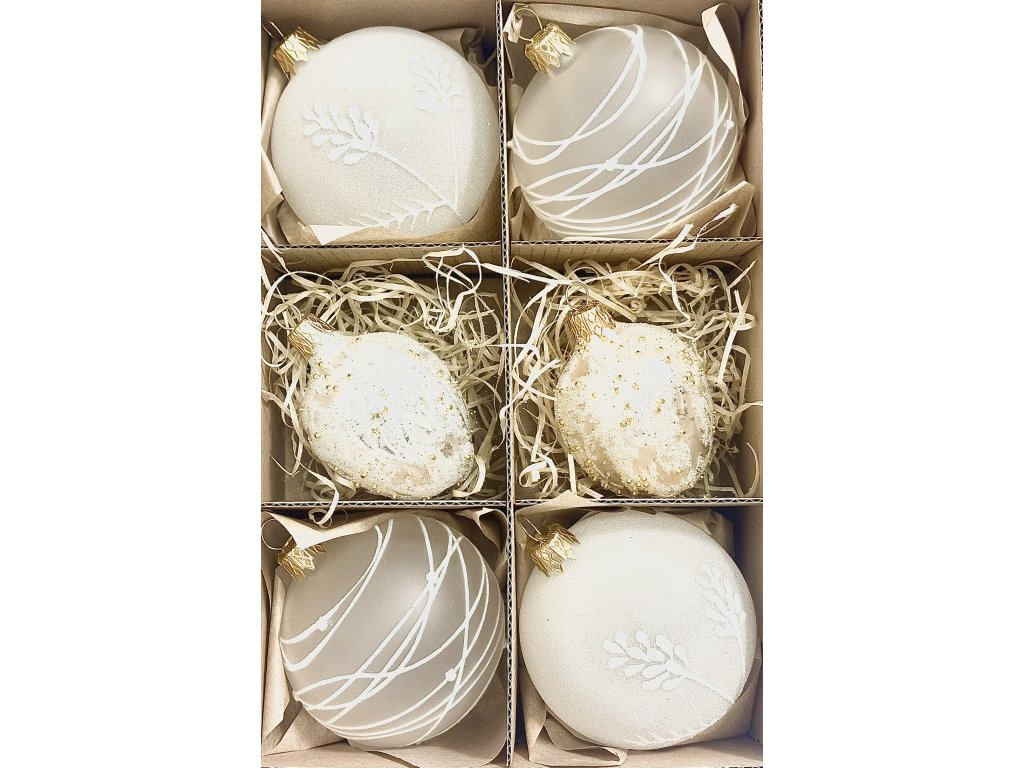 Tato luxusní sada v bílo-zlatém tónu vnese do vašeho domova klid, eleganci a přírodní kouzlo. Čtyři skleněné koule s jemnými motivem klásků a ladnými liniemi doplňují dva dekorativní ořechy s bohatou strukturou a zlatým leskem. Každá ozdoba je ručně foukaná a malovaná českými skláři v tradiční manufaktuře Irisa Vsetín, která zachovává poctivé sklářské řemeslo. Zlacené detaily a perleťový efekt vytvářejí dojem decentního luxusu, díky kterému se tato sada hodí nejen na vánoční stromeček, ale i do slavnostních aranžmá. Nechte se unést krásou, která spojuje přírodní motivy, jemnost a klasickou eleganci v jednom.