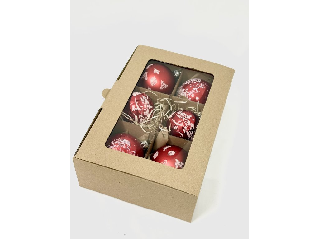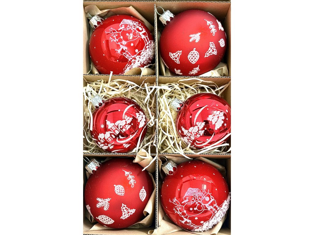 Zahalte svůj stromeček do klasické vánoční atmosféry s touto krásnou sadou červených skleněných koulí zdobených jemnými bílými ornamenty a postavičkami sněhuláka. Lesklé i matné povrchy se zde střídají a vytvářejí elegantní hru světla a stínu. Sada obsahuje čtyři koule o průměru 7 cm a dvě menší o průměru 6 cm, ideálně sladěné pro harmonickou výzdobu stromečku. Každá ozdoba je ručně foukaná a malovaná českými skláři v tradiční manufaktuře Irisa Vsetín, která uchovává dědictví českého sklářství. Tento červenobílý komplet v sobě nese pocit domova, nostalgii i kouzlo zimní pohody, které patří k Vánocům stejně jako světýlka na stromku.