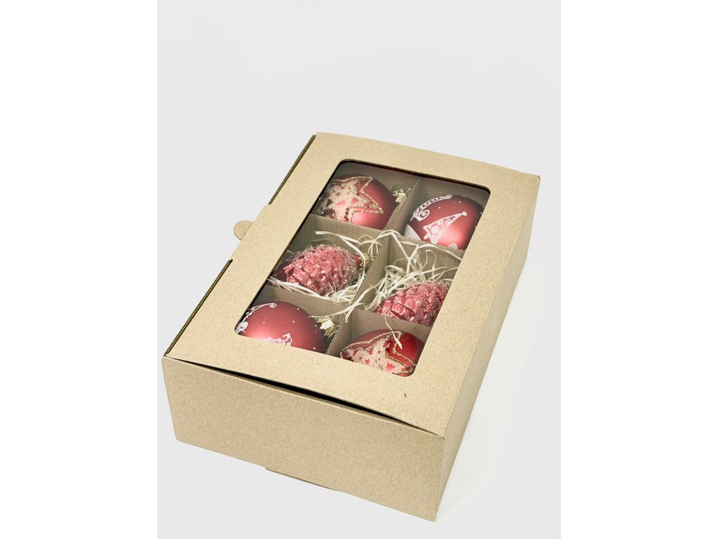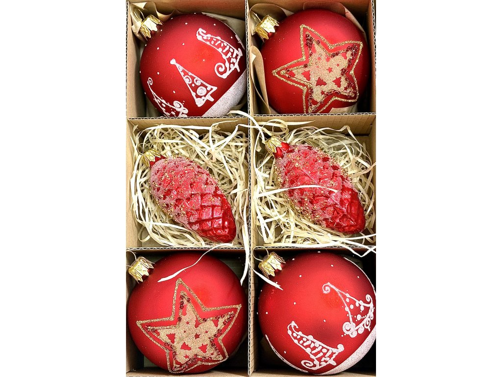 Tato vánoční sada šesti ručně foukaných ozdob přináší klasickou krásu červené barvy Vánoc. Čtyři skleněné koule jsou zdobeny třpytivými hvězdami a veselými motivy čepiček, které symbolizují radost a sváteční náladu. Dvě ozdoby ve tvaru šišky v lesklé červené barvě jsou posypány zlatými a perličkovými akcenty, které dodávají sadě luxusní jiskru. Každý kus vznikl ručním foukáním a zdobením v dílnách Irisy Vsetín, kde se prolíná tradice českého sklářství s jedinečným uměleckým citem. Tato sada rozzáří každý stromeček a vnese do domova teplo, kouzlo a klasickou vánoční atmosféru.Doplňkové parametry