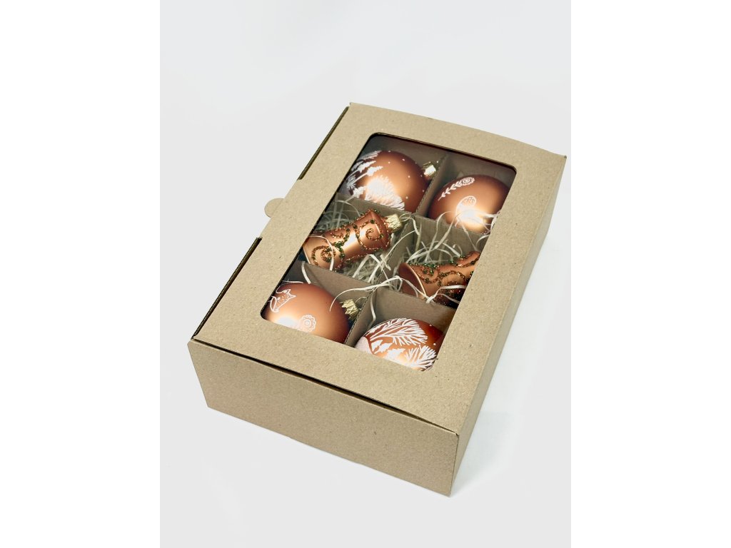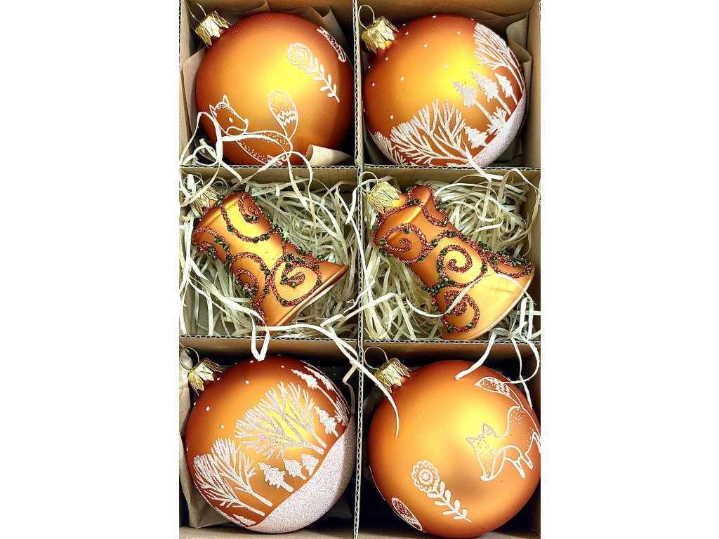 Ponořte se do tepla a kouzla lesních Vánoc. Tato sada šesti skleněných ozdob přináší harmonii přírody a svátečního třpytu. Čtyři kulaté koule v sytém měděném odstínu zdobí jemné motivy lišky, stromů a květin, doplněné o dva zdobené zvonky s reliéfním dekorem v zeleno-zlaté kombinaci. Každá ozdoba je ručně foukaná a malovaná mistry z Irisy Vsetín, kde vznikají tradiční české skleněné vánoční ozdoby s důrazem na detail a kvalitu. Teplý měděný tón spolu s bílými a zlatými akcenty vytváří útulnou a přírodní atmosféru, která vnese do vašeho domova klid a eleganci. Perfektní volba pro milovníky přírodních motivů, rustikálního stylu a originality českého řemesla.Doplňkové parametry