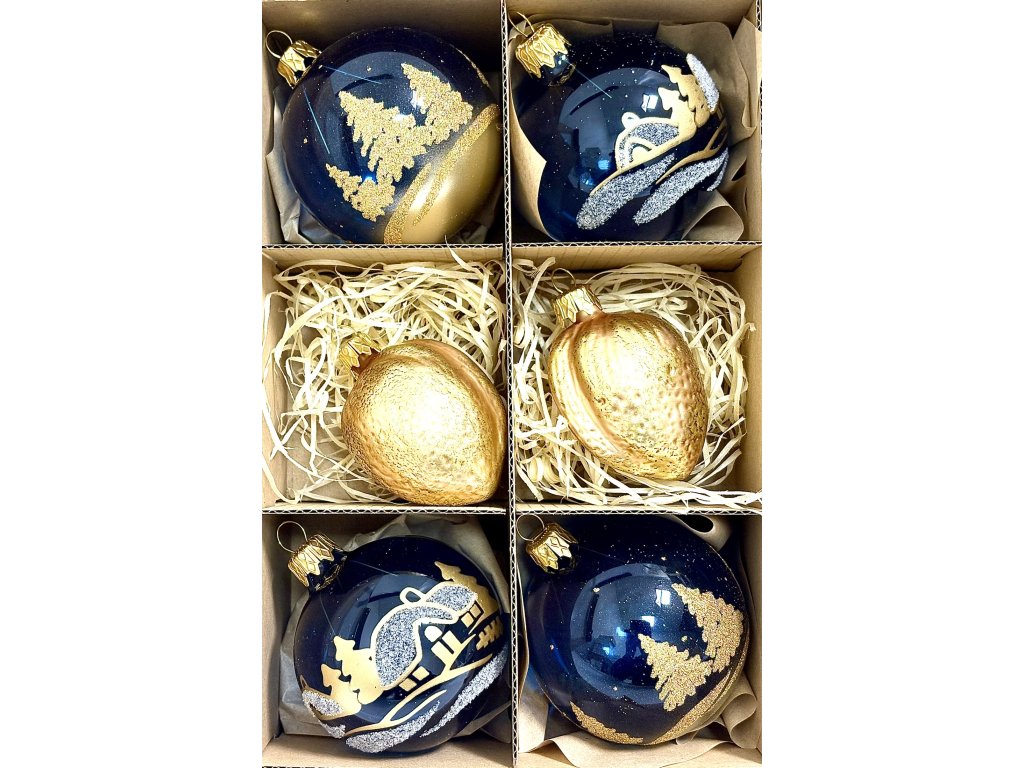 Tato elegantní sada šesti ručně foukaných ozdob spojuje klid zimní krajiny s teplem zlatých tónů. Čtyři skleněné koule v tmavě modré barvě s ručně malovanými motivy vánočních stromků a chaloupek vytvářejí kouzelnou atmosféru zimního večera. Dva zlaté ořechy s jemnou strukturou povrchu symbolizují štěstí a hojnost, a dodávají sadě nádech svátečního luxusu. Každá ozdoba je ručně foukaná, malovaná a zdobená ve sklárně Irisa Vsetín, která po generace uchovává tradici českého sklářského umění. Tato sada je ideální pro slavnostní, elegantní i moderně laděné vánoční stromečky.Doplňkové parametry