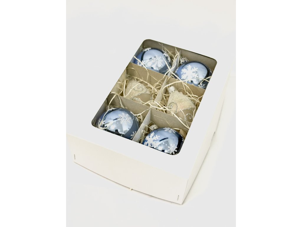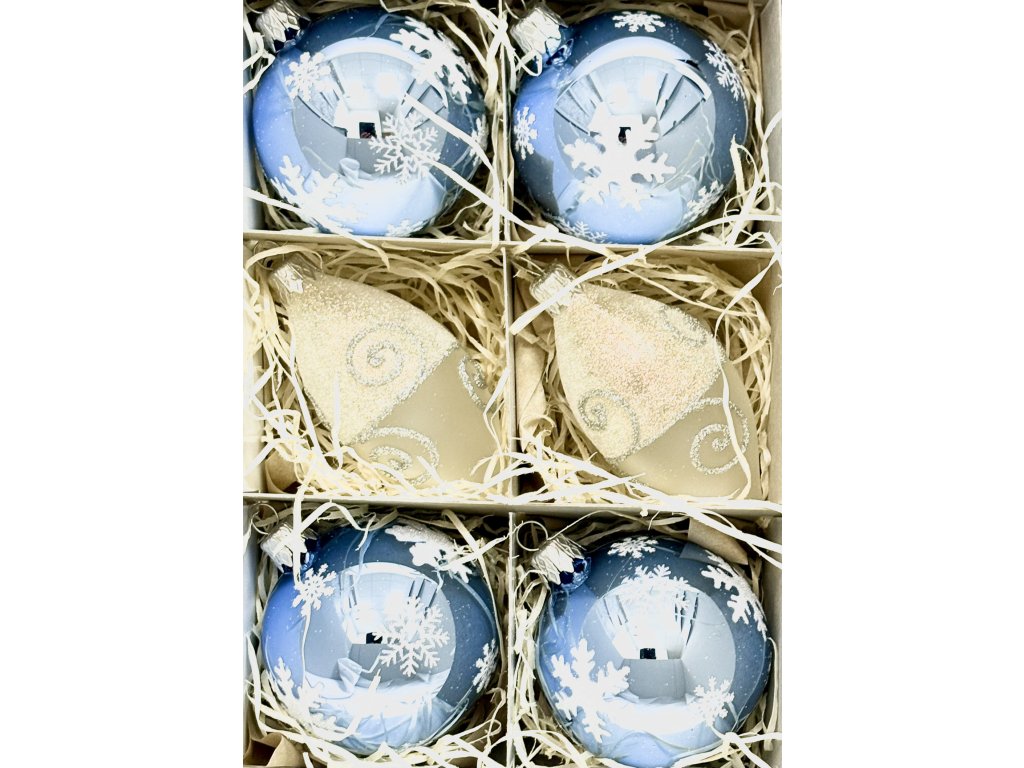Sada vánočních ozdob Modrý mráz – koule a olivy se sněhovými vločkami (6 cm)