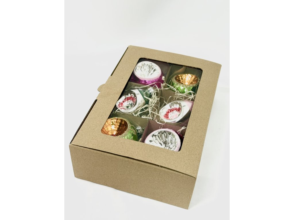 Zavzpomínejte na časy starých Vánoc s touto originální sadou retro ozdob s hlubokými reflektory, které se třpytí každým paprskem světla. Kombinace růžových, zelených a zlatavých tónů vytváří veselý a hřejivý kontrast, který oživí každý vánoční stromeček. Ozdoby mají typický vypouklý tvar s ručně vybrušovaným reflektorem, jenž krásně odráží světlo svíček i řetězů. Každý kus je ručně foukaný a dekorovaný českými skláři, kteří navazují na dlouholetou tradici výroby skleněných vánočních ozdob v Irise Vsetín. Tato sada je ideální pro milovníky klasických českých Vánoc a přinese do interiéru dotek nostalgie, elegance a rodinného tepla.