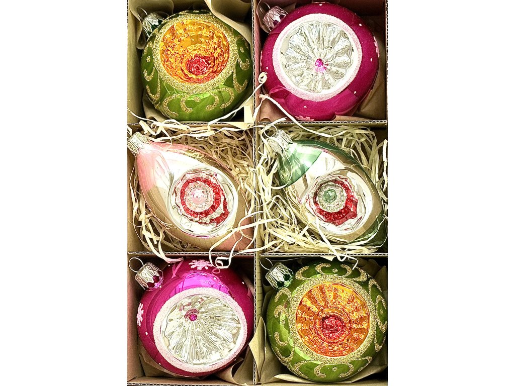 Sada vánočních ozdob Retro reflektory – růžovo-zelená kombinace (7 cm)