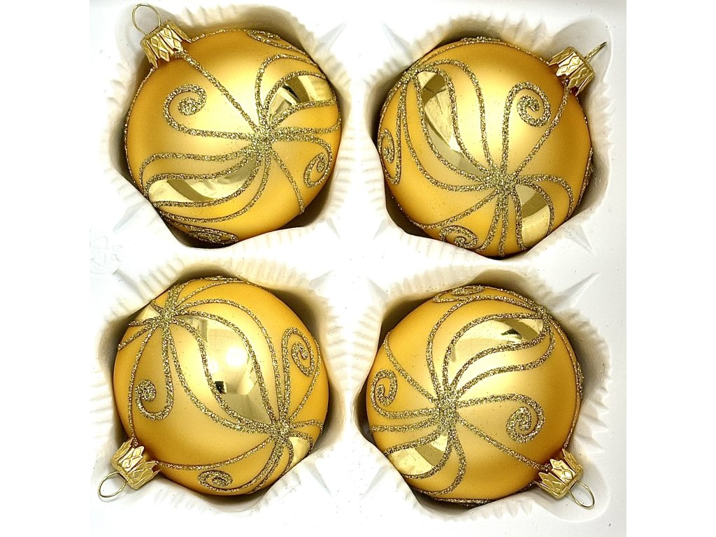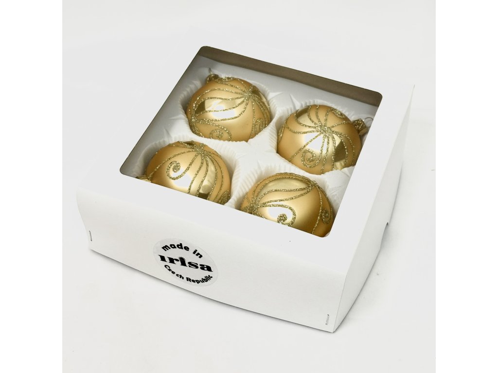 Tato sada čtyř ručně foukaných skleněných vánočních koulí o průměru 7 cm z dílny Irisa Vsetín je dokonalým symbolem svátečního luxusu a elegance. Kombinace matného a lesklého zlata vytváří okouzlující kontrast, který doplňuje bohatý glitrový ornament inspirovaný hvězdným tancem světla. Každá ozdoba je výsledkem pečlivé ruční práce českých sklářů, kteří spojují tradici s uměleckým citem pro detail. Tyto tradiční české vánoční ozdoby rozzáří stromek teplým odleskem a dokonale ladí s bílými, červenými či smetanovými koulemi. Elegantní dárkové balení z nich činí ideální volbu i jako reprezentativní dárek pro milovníky poctivého českého skla.Doplňkové parametry