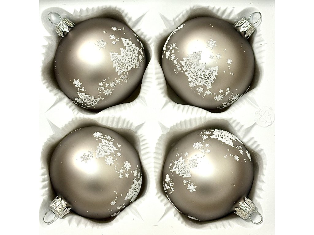 Šedé skleněné vánoční koule se stromečkem a vločkami – sada 4 ks (7 cm)