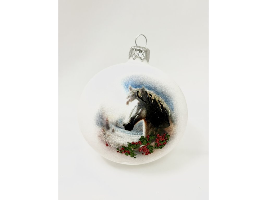 Skleněná vánoční koule 8 cm – Bílý kůň se zimním motivem a vlastním textem