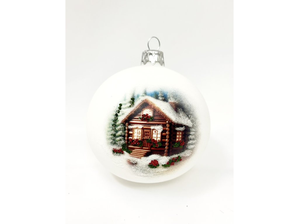 Ručně foukaná skleněná koule o průměru 8 cm s motivem zasněžené chaloupky a vánočních věnců. Dodává se v dárkovém balení, možnost personalizace textem.