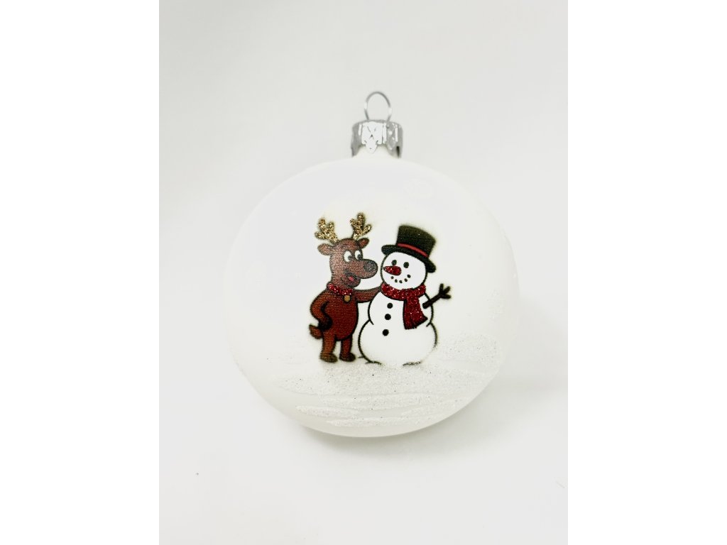 Skleněná vánoční koule 8 cm – Sob a sněhulák s možností vlastního textu