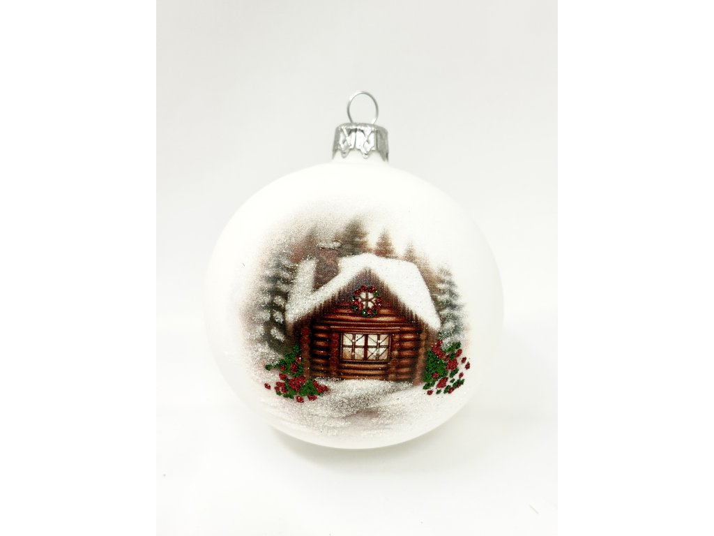 Skleněná koule o průměru 8 cm s motivem zasněžené chaloupky. Ruční výroba, luxusní balení a možnost doplnit ozdobu vlastním textem.