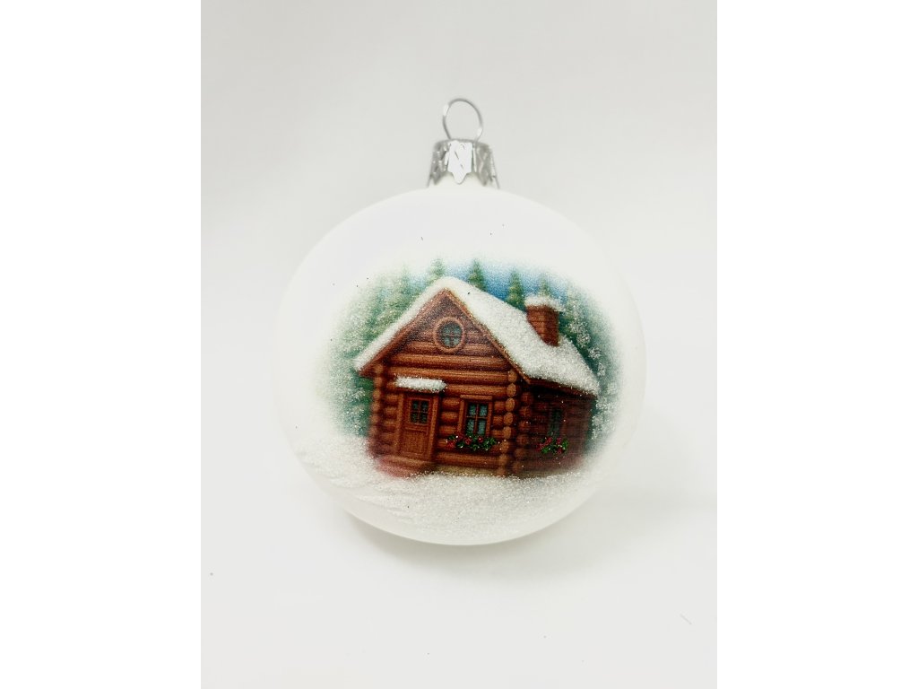 Ručně foukaná skleněná koule o průměru 8 cm s motivem zasněžené chaloupky a vánočních věnců. Dodává se v dárkovém balení, možnost personalizace textem.