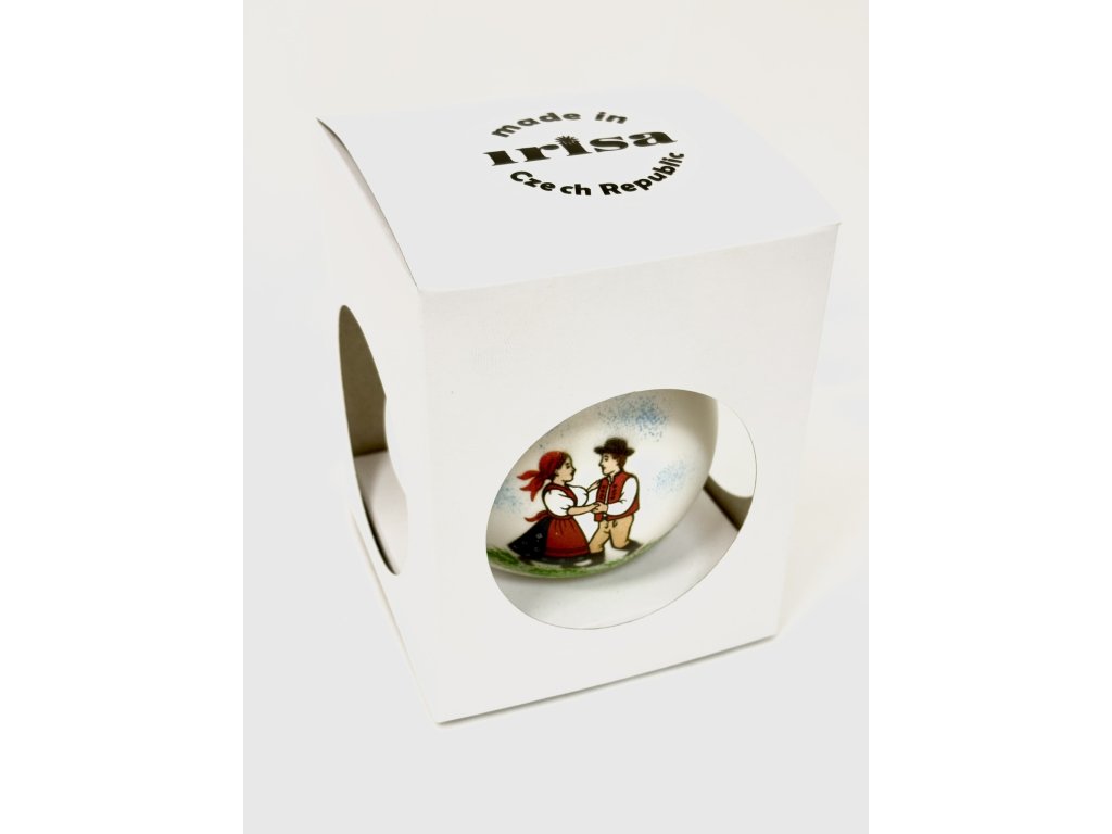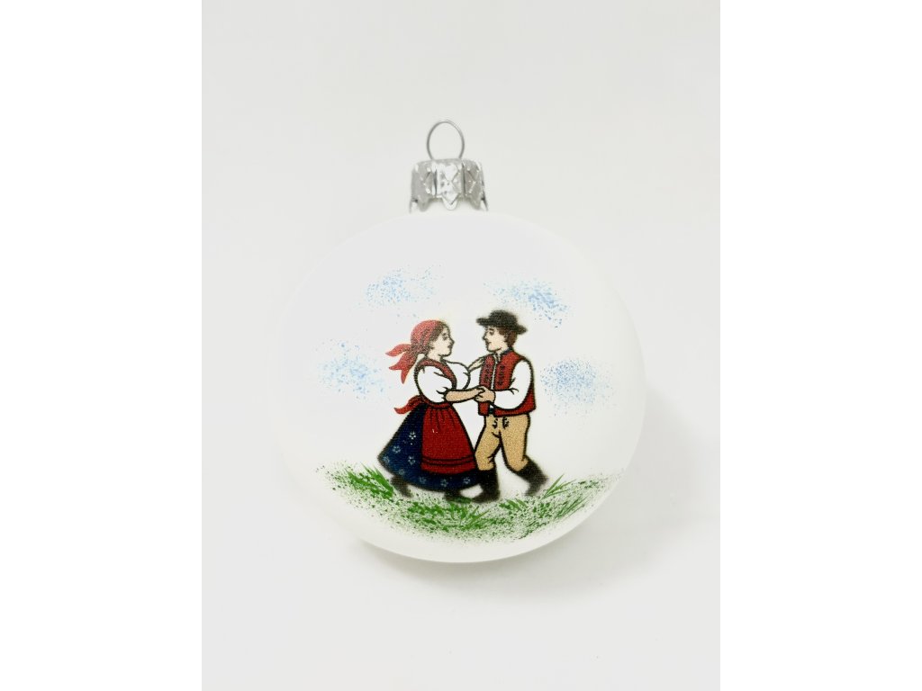 Tato originální skleněná vánoční ozdoba o průměru 8 cm je poctou valašské tradici a folklóru. Z jedné strany zdobí kouli detailně malovaný pár v krojích, tančící v přírodním prostředí, z druhé strany pak elegantní nápis „Pozdrav z Valašska“ s jemným ornamentem. Každá ozdoba je ručně foukaná a malovaná přímo ve Vsetíně v dílnách Irisa, kde se snoubí řemeslná zručnost s láskou k regionu. Matný bílý základ dodává dekoraci jemnost a slavnostní nádech, zatímco tradiční motiv činí z ozdoby jedinečný kousek, který potěší milovníky folklóru i vánočních tradic. Díky svému balení je koule ideálním dárkem a zároveň stylovým suvenýrem z Valašska. Skvěle se hodí jak na vánoční stromeček, tak i jako celoroční připomínka domova, tradice a rodinných kořenů.Doplňkové parametry