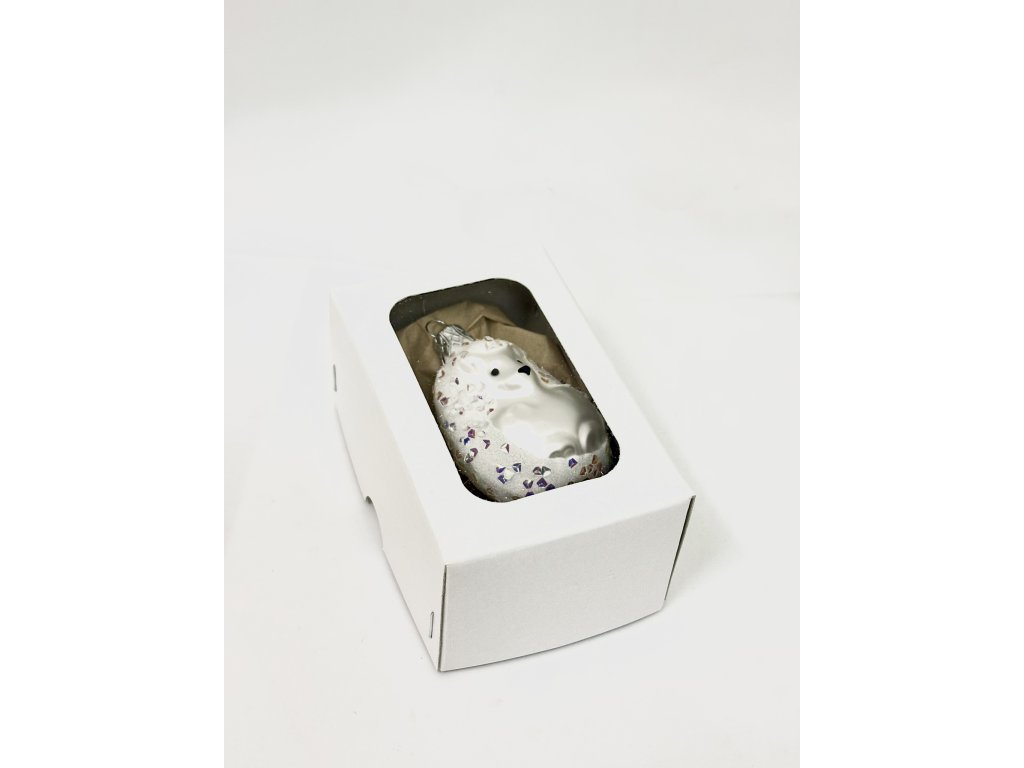 Skleněná vánoční ozdoba Ježek v zimním kožíšku – bílý třpyt 8 cm