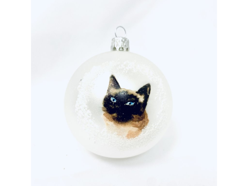 Skleněná vánoční ozdoba s textem na přání - Kočka Modroočka s vlastním textem (1 ks, 8 cm)