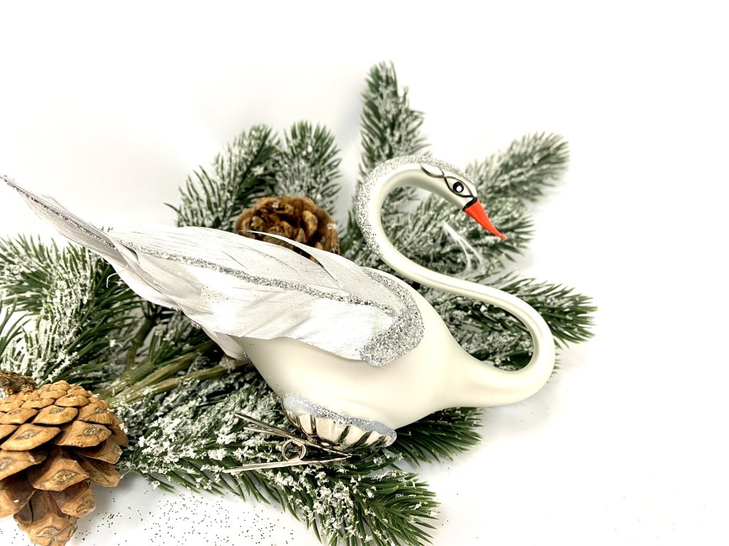 Labuť je pečlivě zpracovaná s detaily, které dodávají ozdobě zvláštní kouzlo. Je umístěna na skřipci, která jí dává dojem lehkosti a pohybu.