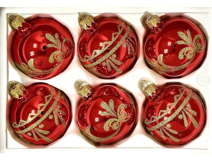 Luxusní skleněné vánoční koule v zářivě červené barvě s ručně malovanými zlatými ornamenty. Tradiční elegance, která rozzáří váš vánoční stromek. Vyrobeno v České republice...