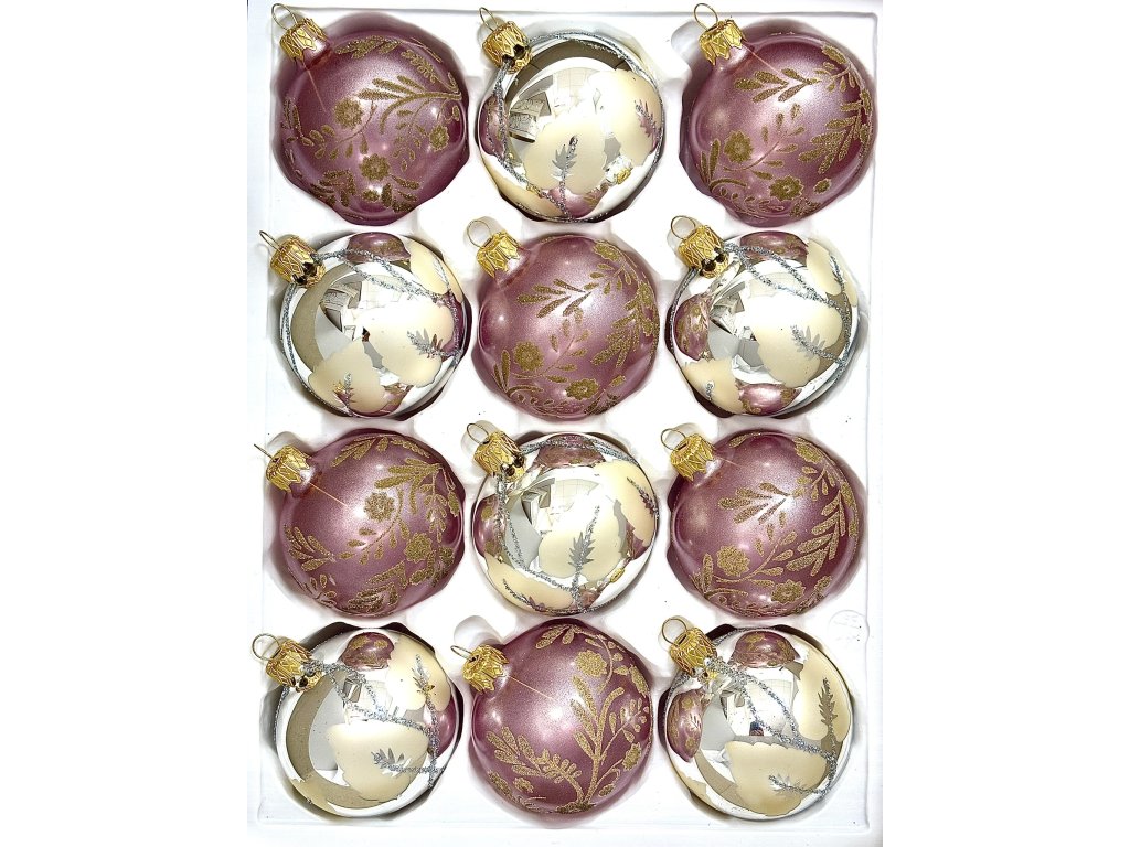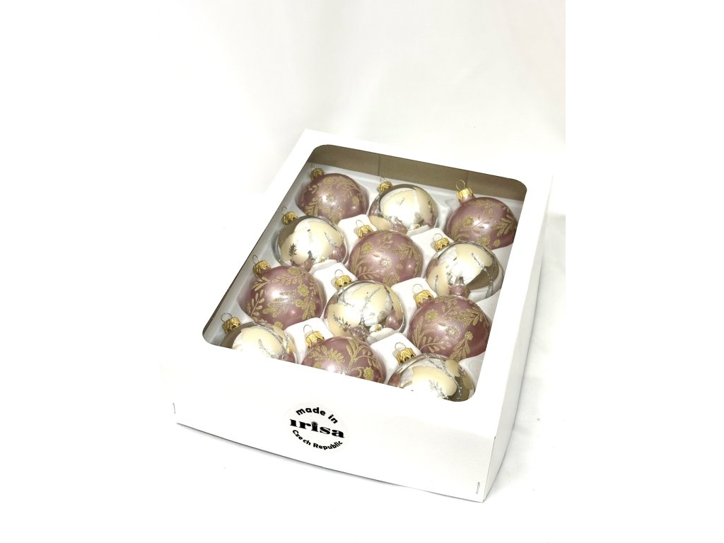 Tato jedinečná sada 12 skleněných vánočních koulí o velikosti 7 cm vnese do vašeho domova jemnost, eleganci a romantickou atmosféru. Starorůžové koule jsou zdobené zlatým květinovým dekorem, zatímco krémové a stříbrné koule s jemnými linkami dodávají celé sadě slavnostní nádech. Každý kus je ručně foukaný a malovaný ve vsetínské sklárně Irisa, kde se po generace udržuje tradice českého sklářského řemesla. Tyto ozdoby jsou ideální volbou pro milovníky luxusních a neotřelých kombinací, které zvýrazní krásu vánočního stromečku i celého interiéru.Doplňkové parametry
