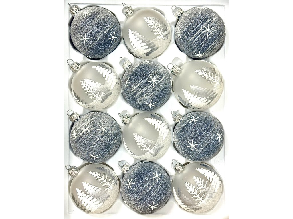 Vneste na svůj vánoční stromeček kouzlo zimní krajiny s touto jedinečnou sadou skleněných vánočních ozdob o průměru 7 cm. Kombinace matné bílé a lesklé stříbrné působí slavnostně a elegantně, zatímco detailní motivy sněhových vloček a zasněžených stromků navozují atmosféru klidné zimní noci. Tyto ručně vyráběné vánoční koule představují tradiční českou práci sklářských mistrů a skvěle se hodí jak k moderním, tak i klasickým vánočním dekoracím. Jsou ideální pro ty, kteří hledají luxusní a nadčasovou výzdobu, která zaujme na první pohled. Díky univerzálnímu barevnému ladění je snadno zkombinujete s dalšími ozdobami.Doplňkové parametry