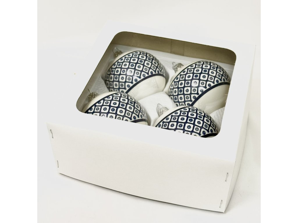Tradiční české skleněné vánoční ozdoby 8 cm – modrobílý folklorní vzor, sada 4 ks