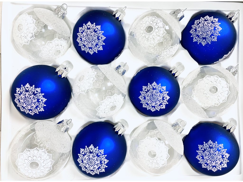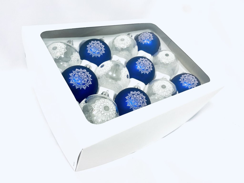 UNIKÁT "Bílo Modrá Sada 12 ks Skleněných Ozdob - Dekor 'Zasněná a Zasněžená' (Velikost 7cm)"