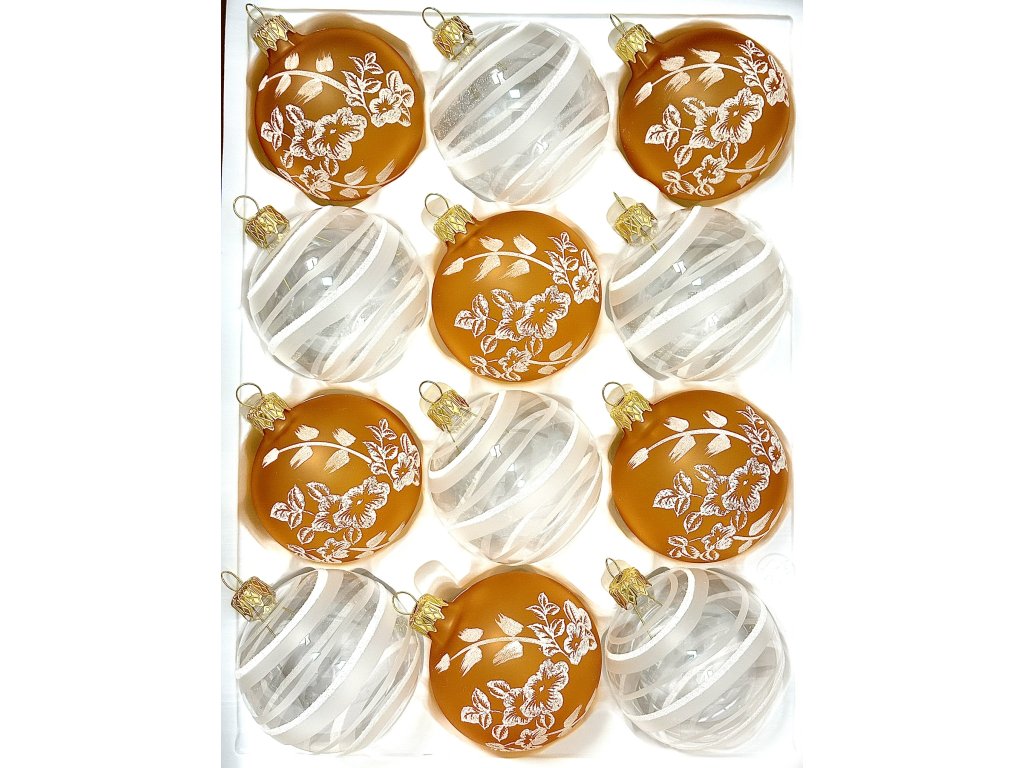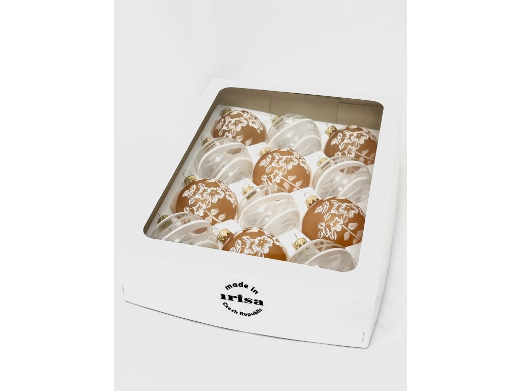 Tato originální sada 12 skleněných vánočních koulí o velikosti 7 cm přináší dokonalou souhru dvou designů – teplého měděně zlatého tónu s jemnými bílými květy a elegantní čiré koule s bílými pruhy. Každý kousek je výsledkem ruční práce sklářů a malířů z dílny Irisa Vsetín, kde se tradiční řemeslo snoubí s moderní elegancí. Ozdoby vytvářejí na stromečku harmonický celek, který působí luxusně a přitom útulně. Tato sada je ideální volbou pro ty, kdo chtějí spojit tradici českých skleněných ozdob s nevšedním designem, který rozzáří vánoční interiér.Doplňkové parametry