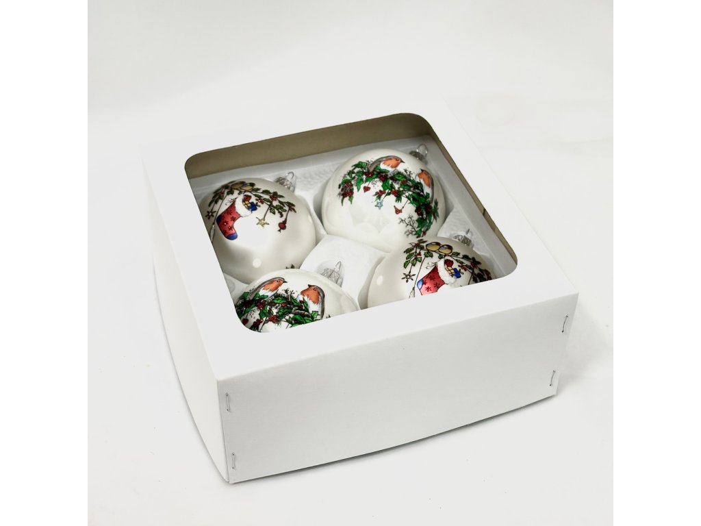 Tyto koule spojují klasické vánoční kouzlo s milým přírodním motivem. Na dvou koulích se objevují roztomilí ptáčci na větvičkách s cesmínou, zatímco druhé dvě zdobí vánoční punčocha plná dárků, visící mezi větvičkami s bobulemi. Barevná kombinace bílé, červené, zelené a zlaté vytváří útulný a tradiční vzhled, který na stromku vynikne i v kombinaci s dřevěnými nebo slaměnými ozdobami. Každá koule je ručně foukaná a precizně dekorovaná v české sklárně Irisa Vsetín, která navazuje na více než šedesátiletou tradici výroby vánočních ozdob. Sada je balena v elegantní bílé krabičce s průhledem – ideální jako vánoční dárek nebo nostalgická ozdoba do interiéru, kde probudí hřejivou atmosféru Vánoc.Doplňkové parametry