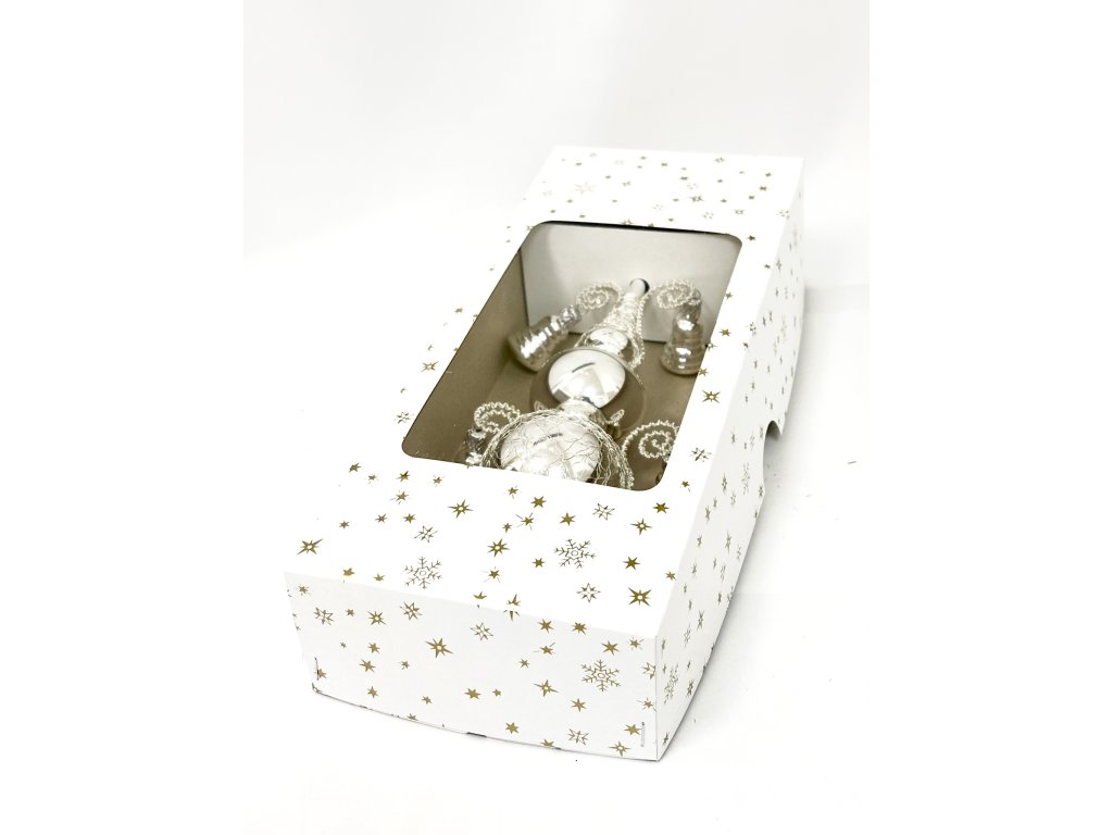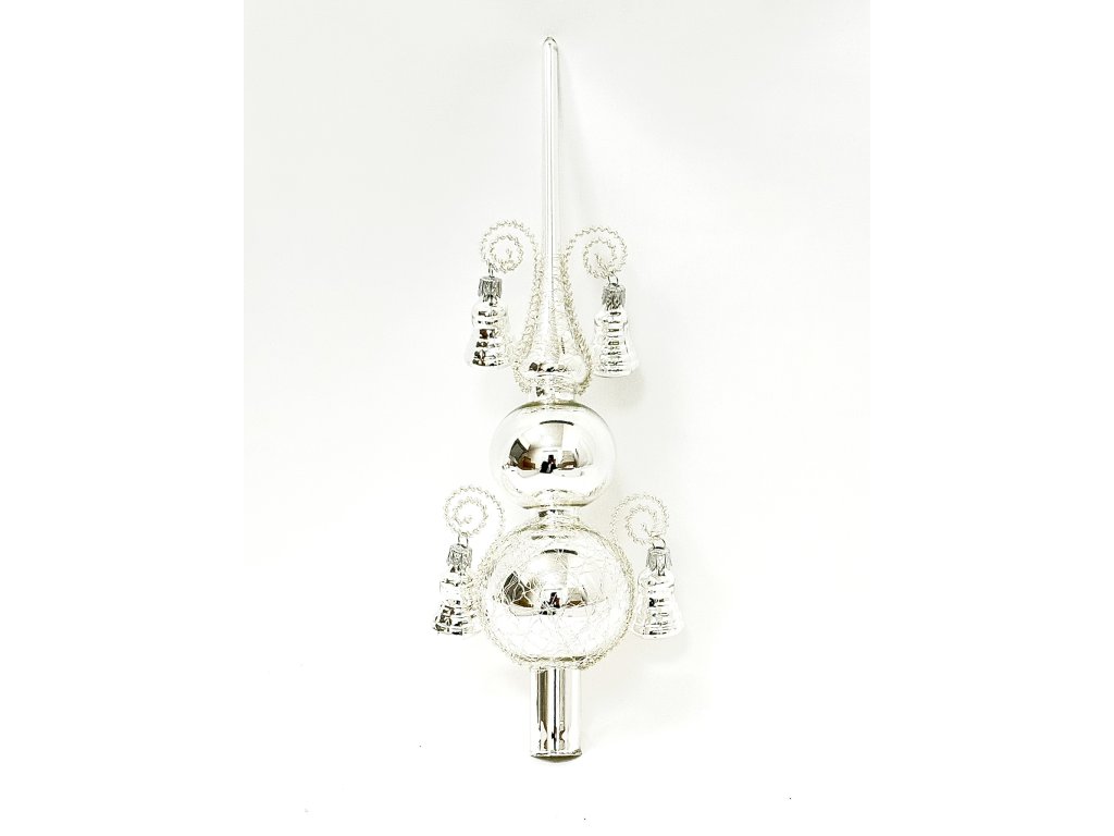 Tato stříbrná vánoční špice je ručně vyráběná z jemného foukaného skla a doplněná čtyřmi skleněnými zvonečky, které symbolizují vánoční radost a čistotu. Lesklý povrch odráží světlo svíček i řetězů a rozzáří celý stromek. Každý detail vznikl rukou zkušeného skláře, díky čemuž se tato ozdoba řadí mezi tradiční české vánoční ozdoby. Špice o výšce 28 cm dokonale ladí s klasickými i moderními kolekcemi a přináší do vašeho domova ten pravý vánoční třpyt a noblesu.Doplňkové parametry
