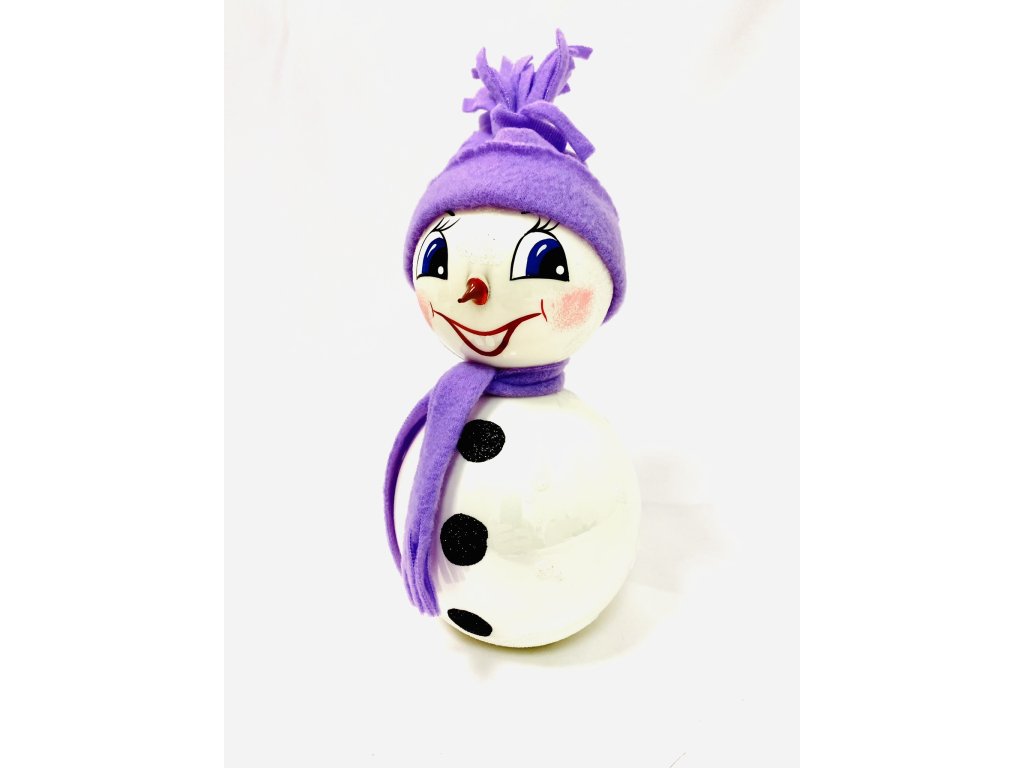 Začarovaný sněhulák: Úsměv vánočního zázraku s fialovou čepicí, 18 cm