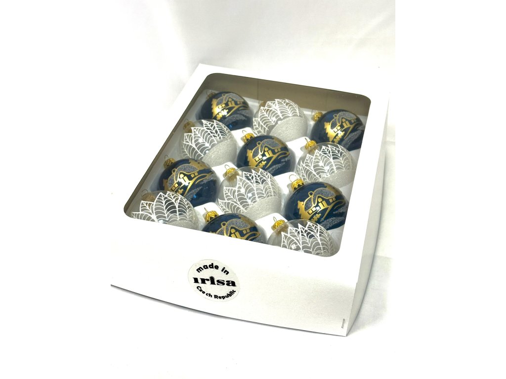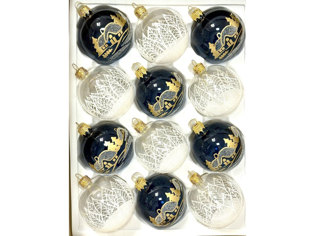 Tato sada 12 skleněných vánočních koulí o velikosti 7 cm přináší na váš stromeček kouzlo zimní pohádky. Tmavě modré koule zdobí ručně malovaný motiv vesničky se zlatými a stříbrnými detaily, zatímco čiré koule jsou dekorovány jemným vzorem připomínajícím zasněžené větvičky a ledové krystalky. Spojení tmavě modré hloubky a čistě bílé něhy vytváří elegantní kontrast, který působí slavnostně a zároveň útulně. Každý kus je ručně foukaný a malovaný ve vsetínské sklárně Irisa, kde se česká tradice výroby vánočních ozdob udržuje po generace.Doplňkové parametry