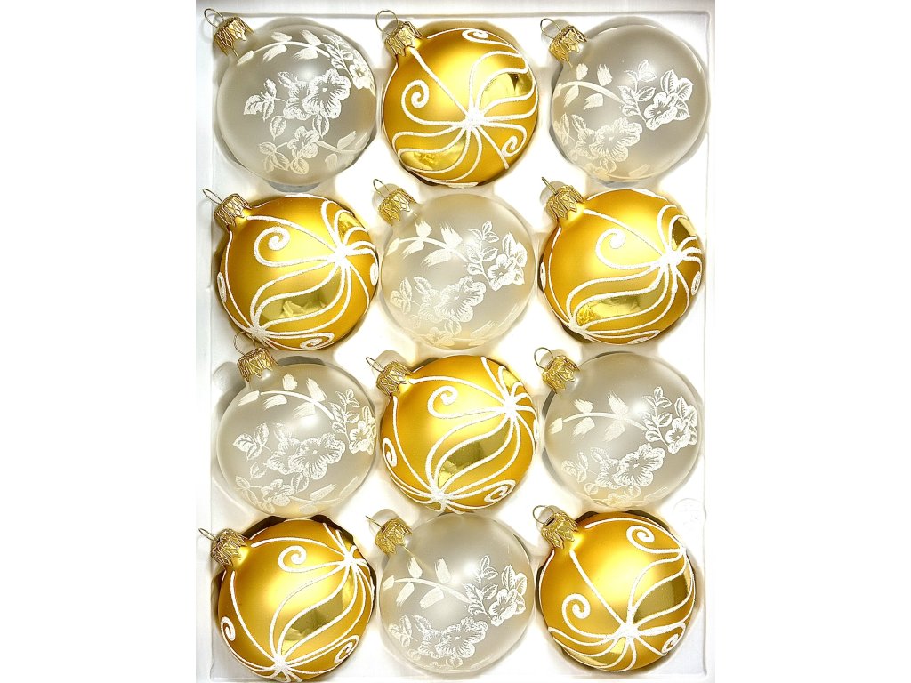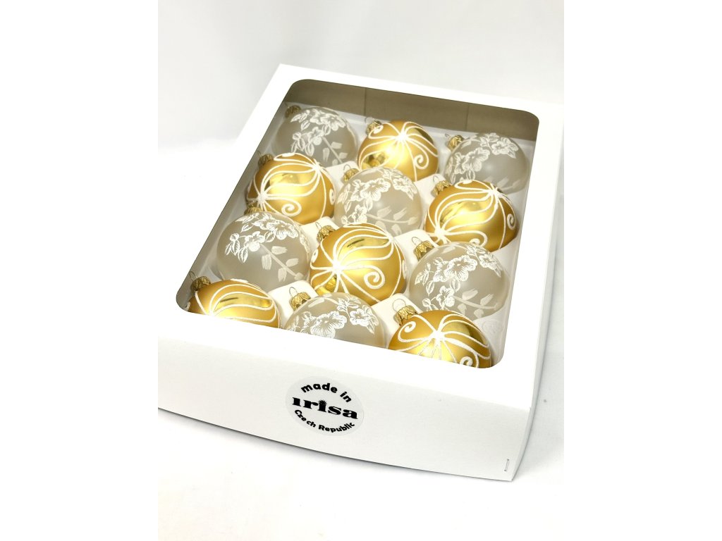 Luxusní sada 12 skleněných koulí o velikosti 7 cm v sobě spojuje eleganci zlatého lesku a jemnost bílého ručního dekoru. Zlaté koule zdobí ladné ornamentální linie, které působí slavnostně a noblesně, zatímco čiré koule doplňuje květinový motiv s jemným zasněženým efektem. Společně vytvářejí harmonický celek, který podtrhne krásu vánočního stromku a vnese do vašeho domova nádech pohádkového luxusu. Každá ozdoba je ručně foukaná a malovaná v tradiční české sklárně Irisa Vsetín, která si uchovává řemeslnou zručnost po celé generace.Doplňkové parametry