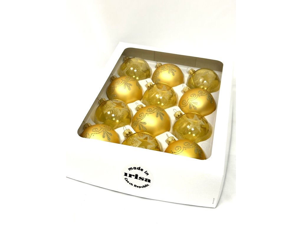 Přineste na svůj vánoční stromeček kousek elegance a kouzla s touto sadou 12 skleněných koulí ve zlatém provedení. Kombinace jemných hvězd a třpytivých ornamentů vytváří slavnostní atmosféru, která rozzáří každý interiér. Ozdoby jsou ručně foukané a malované tradičními technikami v České republice, díky čemuž se jedná o jedinečné kousky s důrazem na detail a kvalitu. Zlatá barva dodává stromku luxusní vzhled, zatímco třpytivé vzory podtrhují kouzelnou náladu Vánoc. Tyto vánoční koule jsou ideální volbou pro milovníky tradičních i moderních dekorací a krásně se kombinují s dalšími skleněnými ozdobami.
