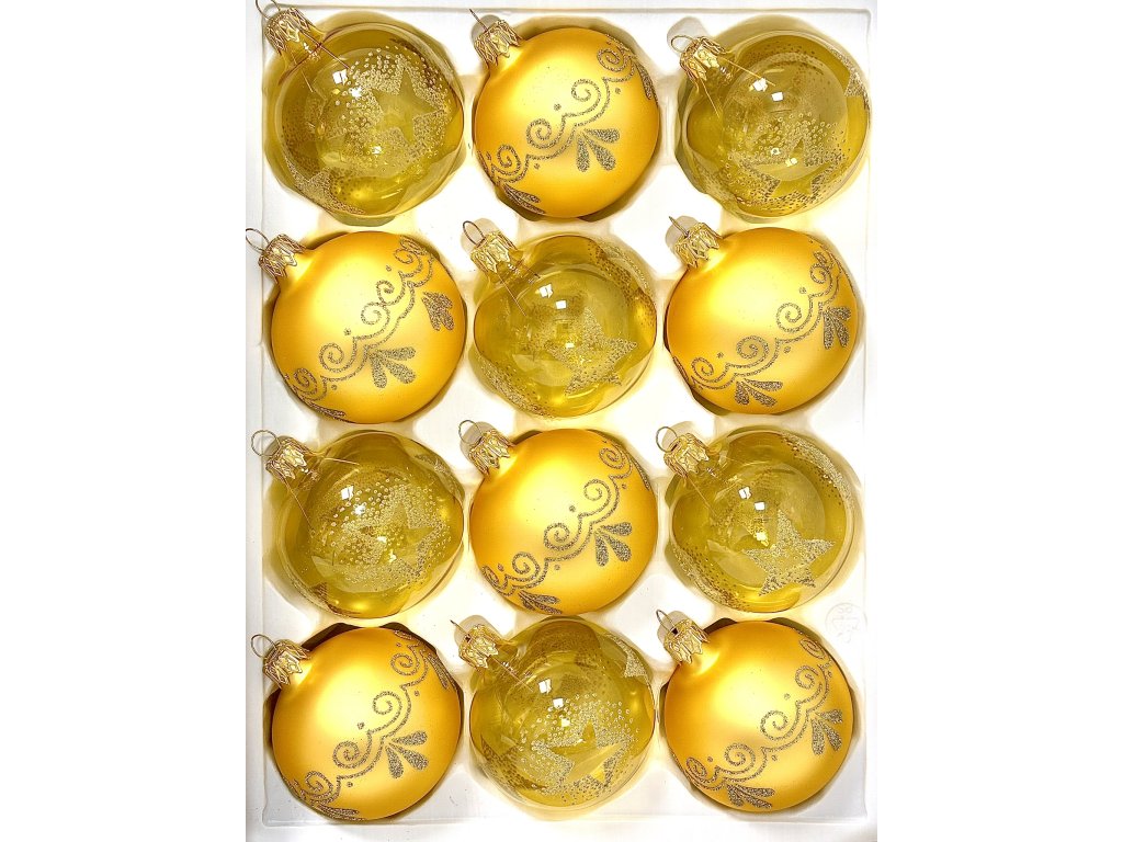 Zlaté vánoční koule s hvězdami a ornamenty – sada 12 ks (7 cm)