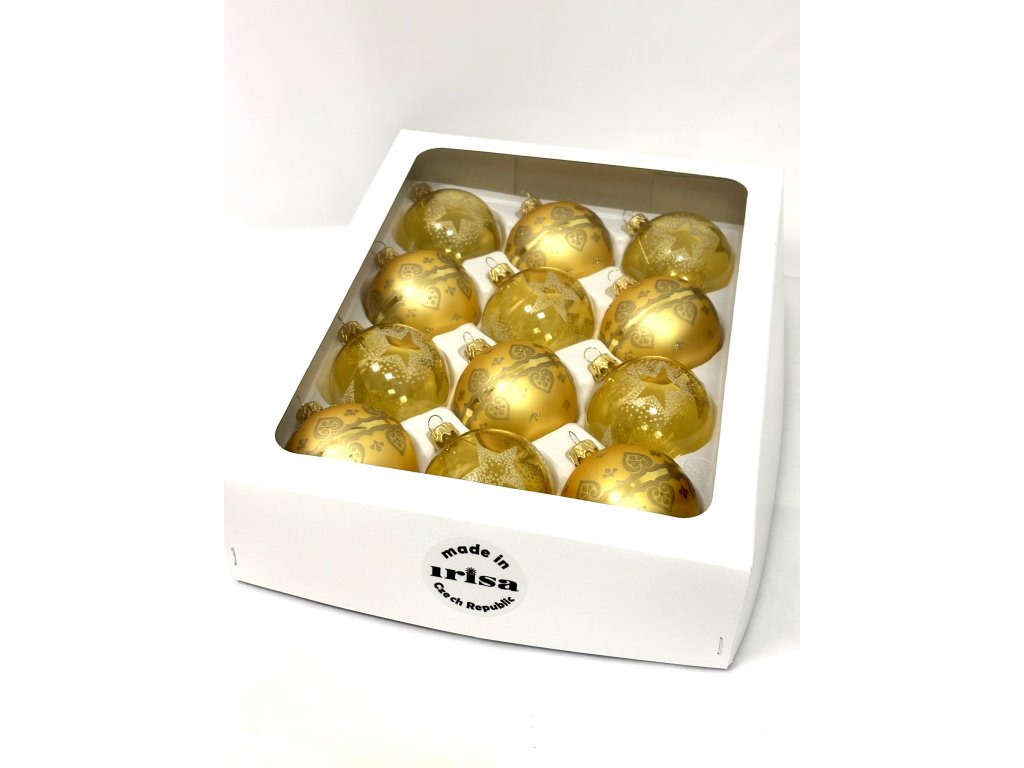 Tato jedinečná sada 12 skleněných vánočních koulí o velikosti 7 cm vnese do vašeho domova hřejivou záři a kouzlo pravých Vánoc. Koule kombinují dva vzory – matné zlato se zlatým dekorem srdíček a ornamentů a čiré sklo zdobené hvězdami s třpytivým mrazovým efektem. Dohromady tvoří harmonický celek, který symbolizuje radost, štěstí a lásku. Každý kus je originál, ručně foukaný a malovaný ve vsetínské dílně Irisa, kde se česká tradice sklářství snoubí s moderní elegancí. Tato sada se skvěle hodí na vánoční stromeček i jako hodnotný dárek pro blízké.Doplňkové parametry