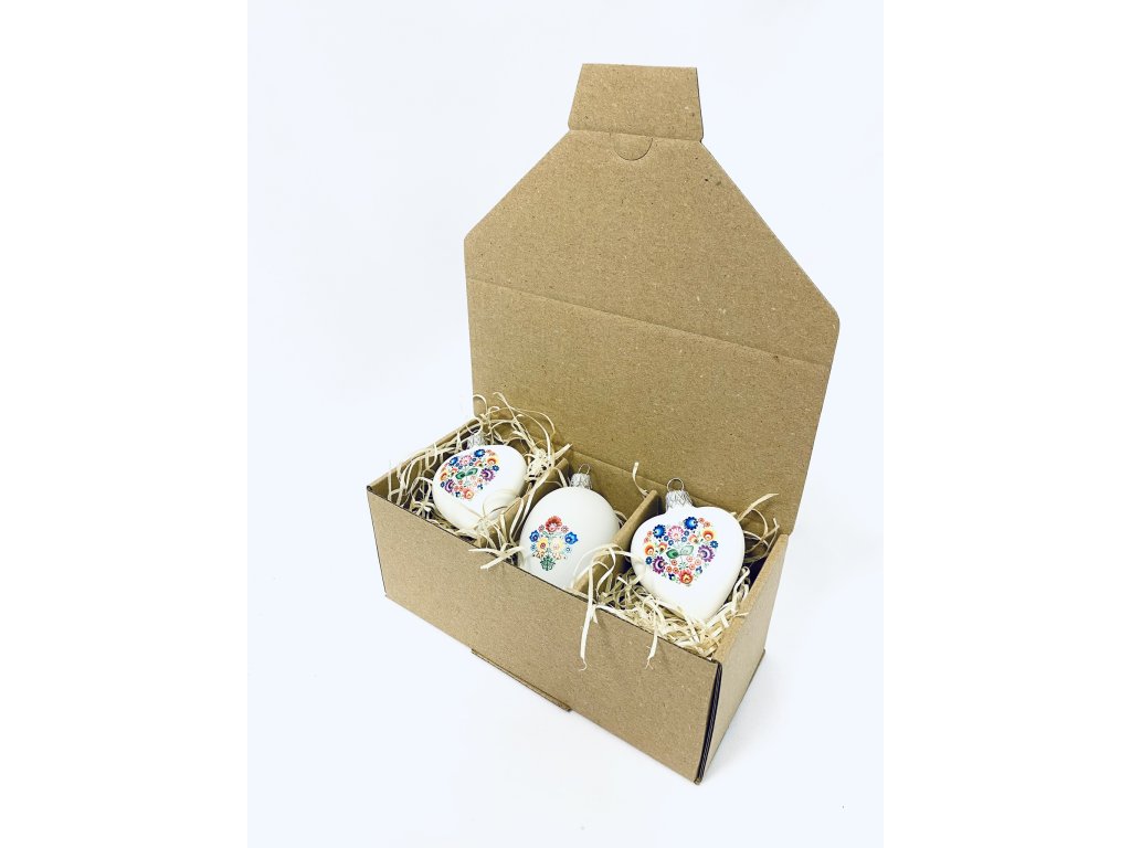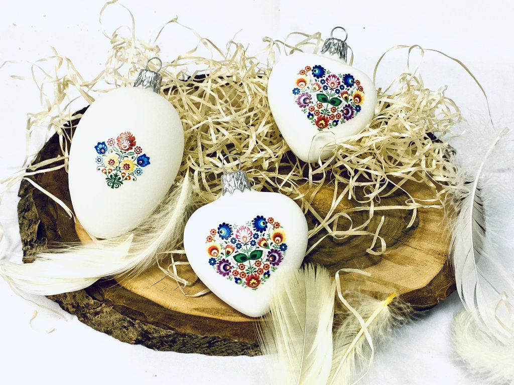 PESACH skleněné velikonoční vajíčko velké a srdce – dekor kytičky 3ks,10 cm a 7 cm, bílé